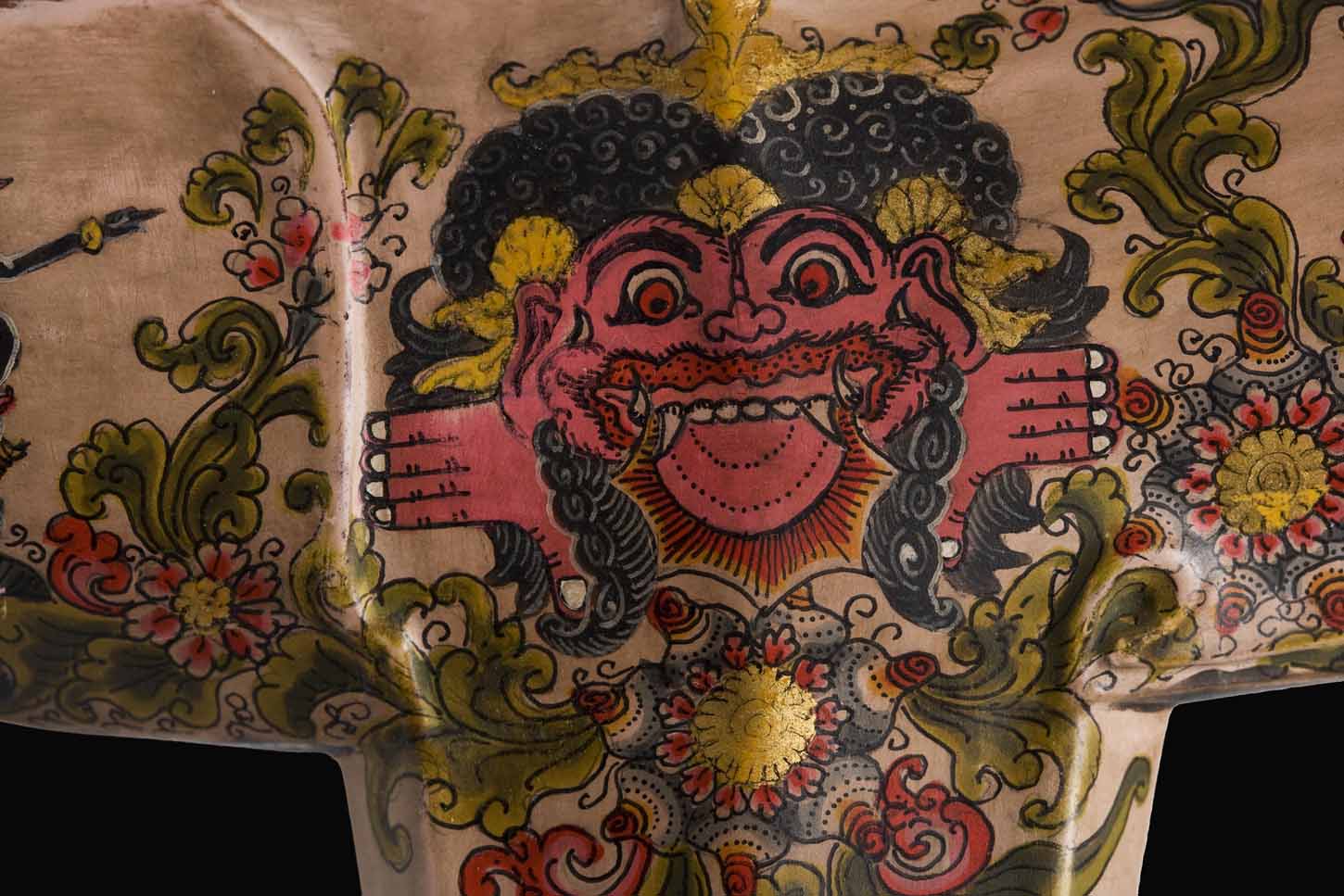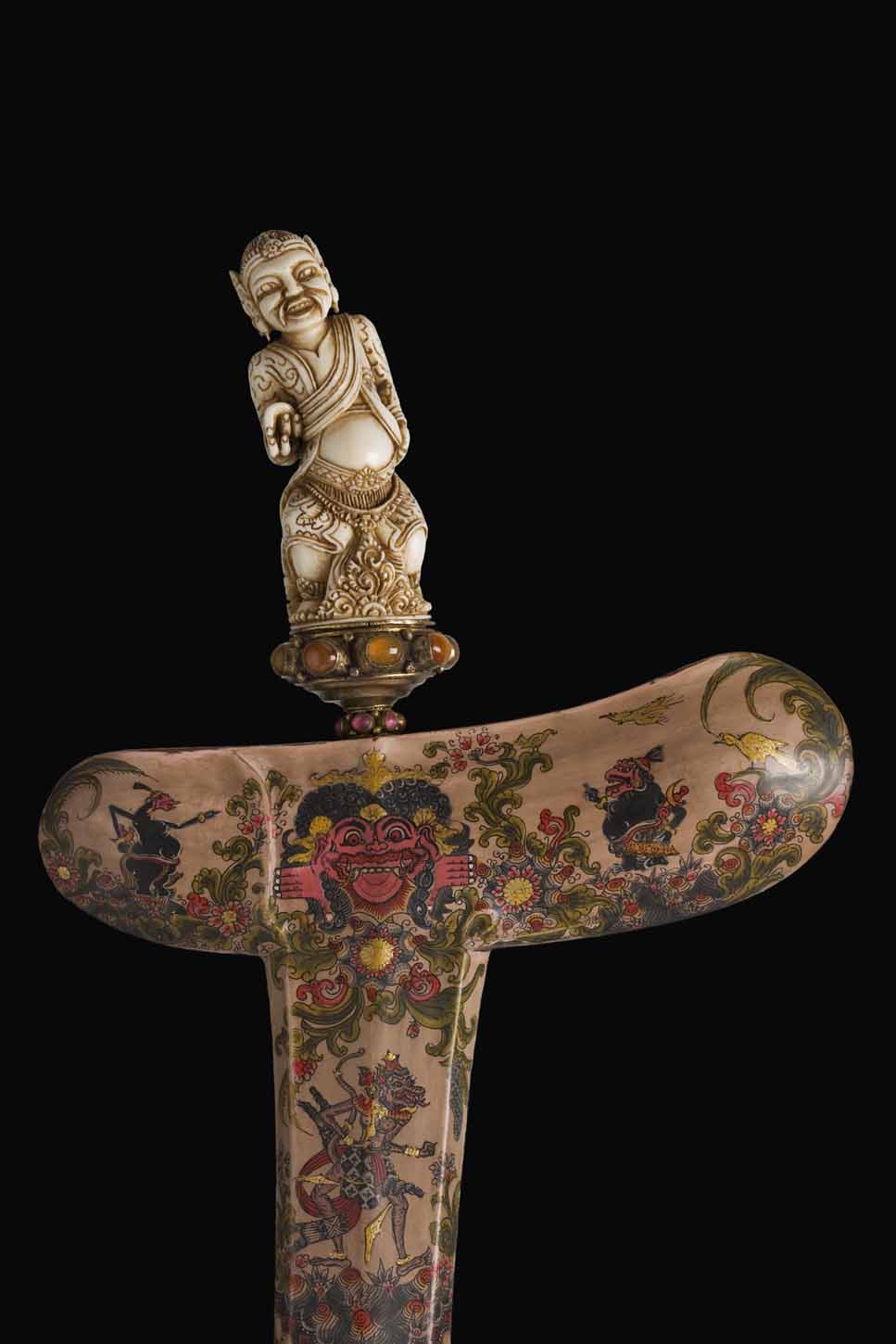 The gandar or scabbard is made of wood and is ornamented in the area corresponding to the wrangka or ship with a representation, in the centre, of Barong – a powerful spirit of Hindu mythology, surrounded by Wayang – Indonesian shadow puppets – figures painted in a varied colour palette over a rose background which is repeated in the buntut or tip. The central area of the hilt’s long part is simply painted in red without any figures.