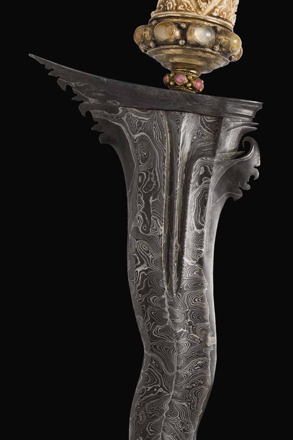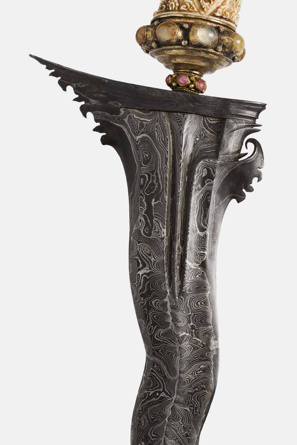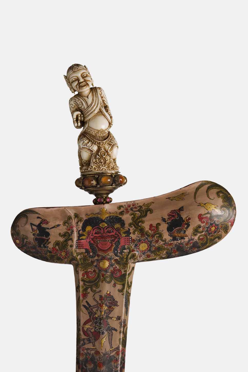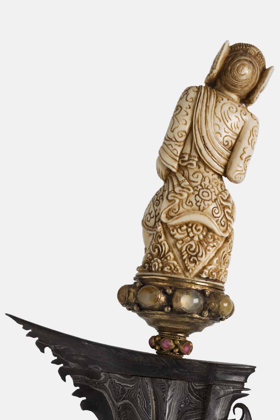The hulu or hilt is made of ivory and was sculpted into the figure of a temple guard in a perfect resemblance, shown in festive clothing, with a moustache and hair curled up behind the head. The selutem or frame where the figure is set is made of gilded silver and is incrusted with numerous agates and rubies cut in cabochon.