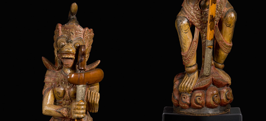 Numa representação do general macaco Hanuman ou Hanumat, este suporte está esculpido numa peça inteira, em madeira policromada.