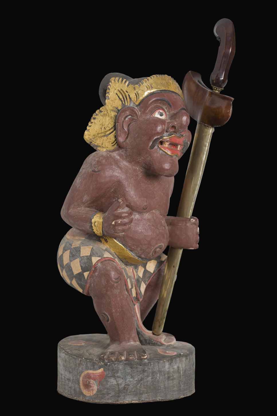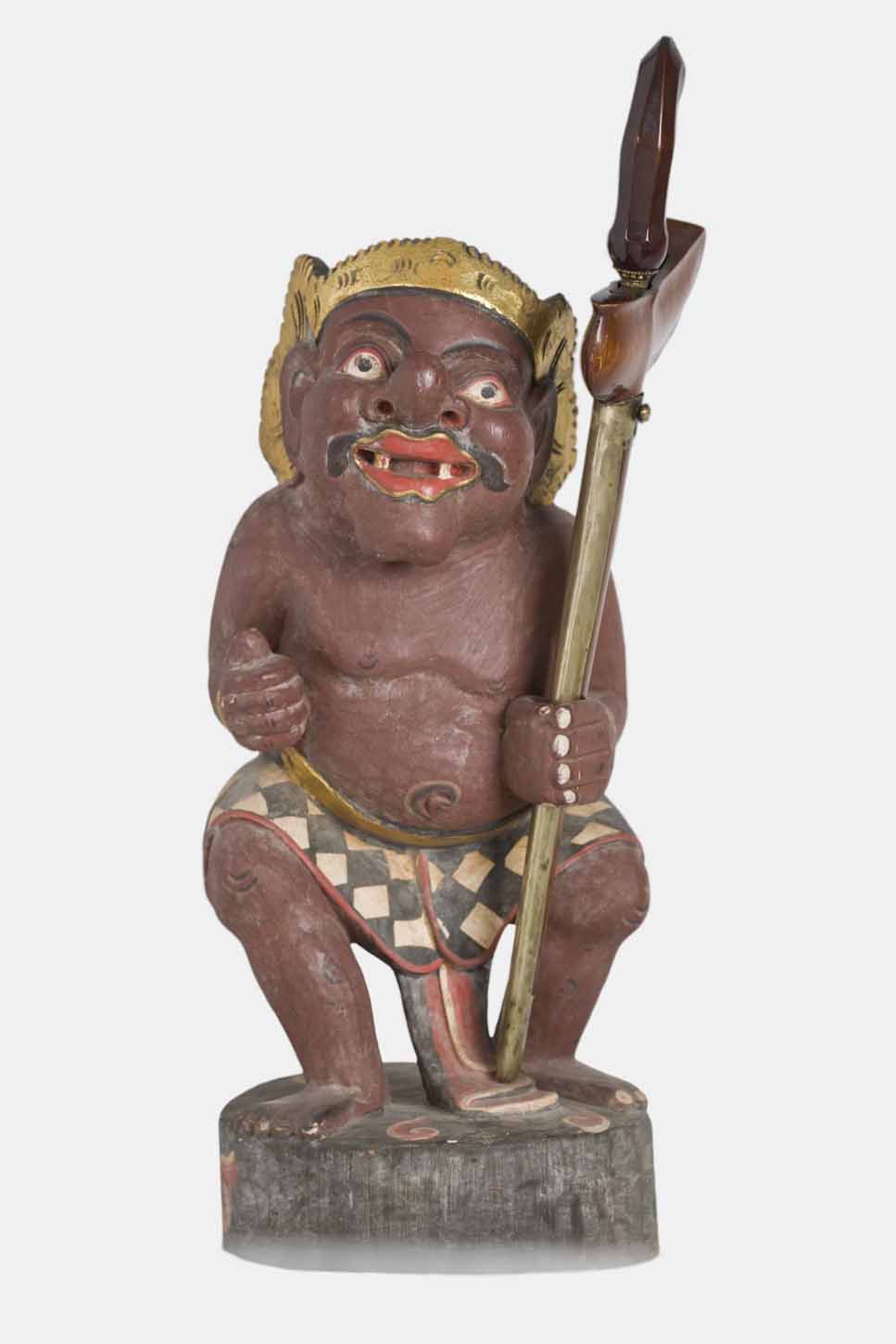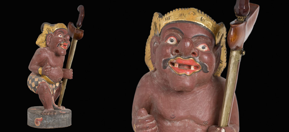 It is represented with a large eared face, well marked eyes, black eyebrows, protruding nose, black moustache and smiling mouth where only two teeth stand out. It is standing with bended knees with the left hand forward as if to grab something (in this case a Kris). A wrapped sarong making a skirt is its only piece of clothing beyond the headdress typical of this area.