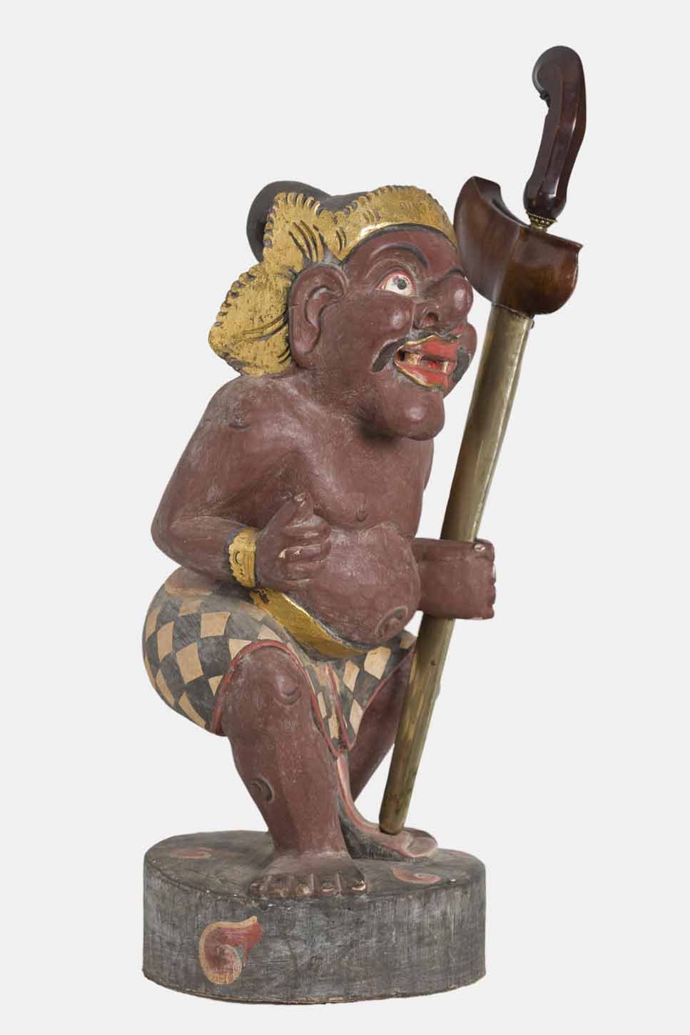 Está representada com uma cara de orelhas grandes, olhos bem demarcados pelas sobrancelhas negras, nariz saliente, negro bigode e boca sorridente onde se destacam dois únicos dentes. Está de pé numa postura de joelhos flectidos, com a mão esquerda ligeiramente avançada em posição de agarrar algo (neste caso um Kris). Um sarong enrolado a formar uma saia, é a sua única indumentária para além do toucado típico desta zona.