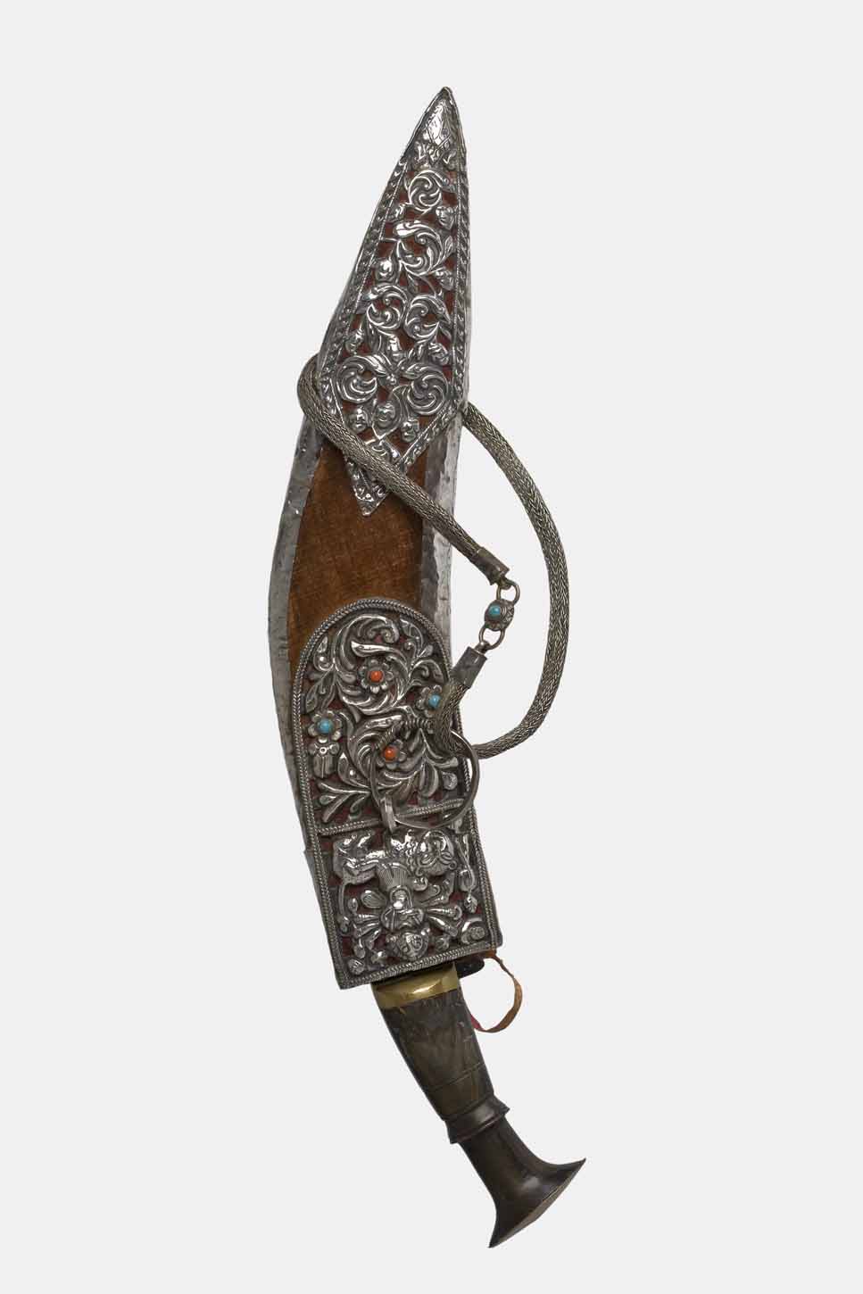 The wooden scabbard is covered in velvet with mounts in pierced and repoussé silver with a central decoration showing the goddess Durga riding a lion. In the upper area it hides two small daggers. The whole ensemble is enriched with cut gems in cabochon cut.