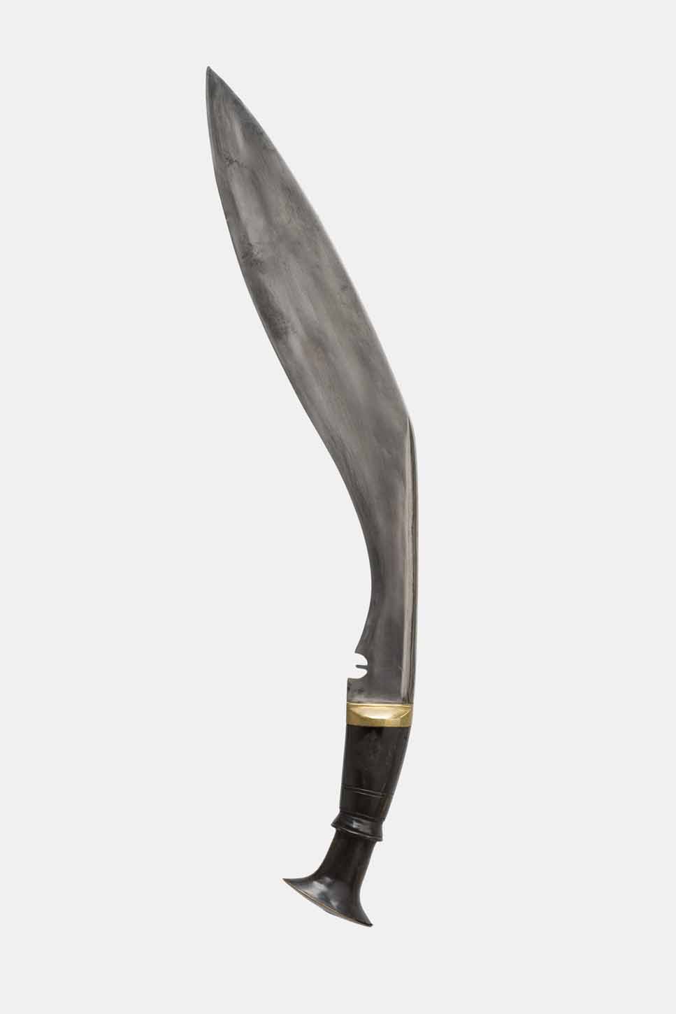 In this piece the blade has the characteristic shape – recurved, with the edge on the concave side and indentation in the shape of a half-moon in the base, near the hilt. The hilt is made of black buffalo horn.