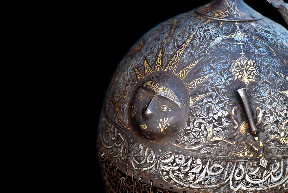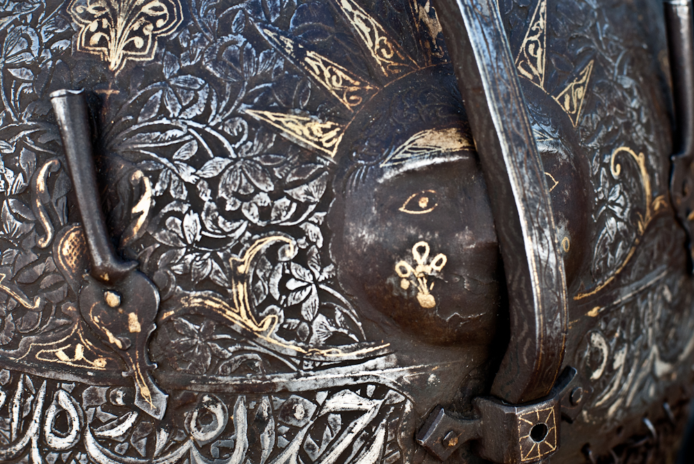 Este capacete é decorado à maneira persa, com três formas antropomórficas do sol radiante, motivos florais e uma barra de escrita persa rematando toda a base do capacete.