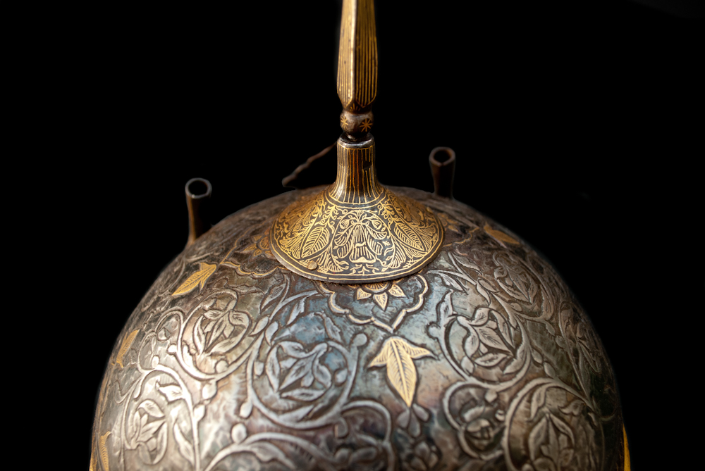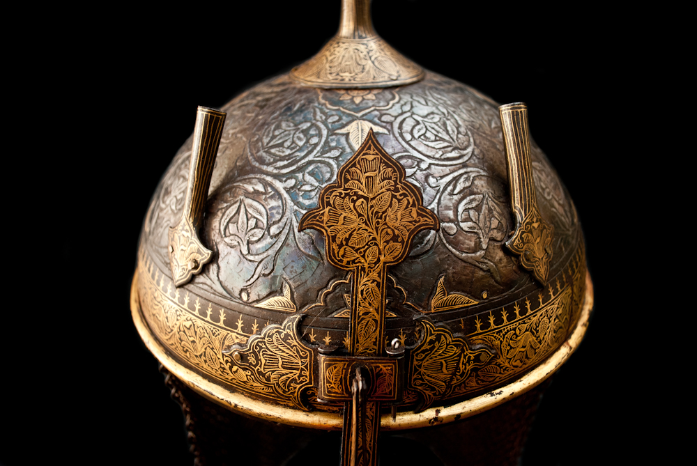 Kulah Khud do norte da Índia, Rajastão em muito bom estado de conservação. Calote com profuso cinzelado e decoração Koftghari com motivos vegetalistas a ouro. Porta plumas, espigão do topo, e protecção nasal em bom estado de conservação e originais.