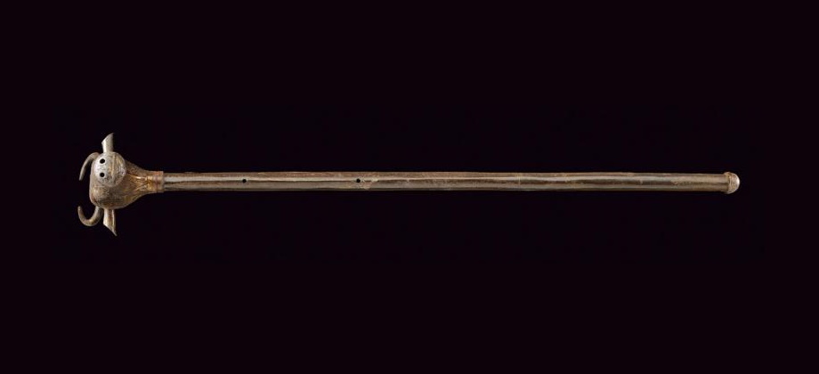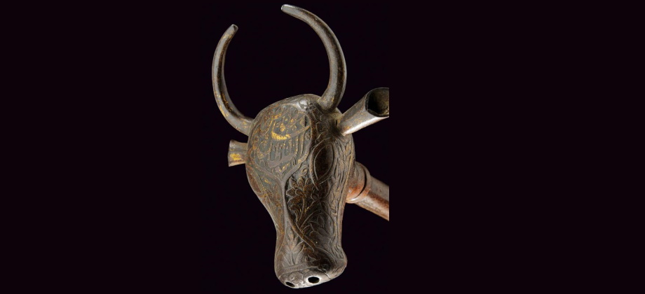 Maça com cabeça em forma de touro, com orelhas e chifres, olhos e orifícios nasais, ricamente gravada com inscrições persas e motivos florais com restos de decoração a ouro. Punho de ferro com restos de decorações, base com pomo.