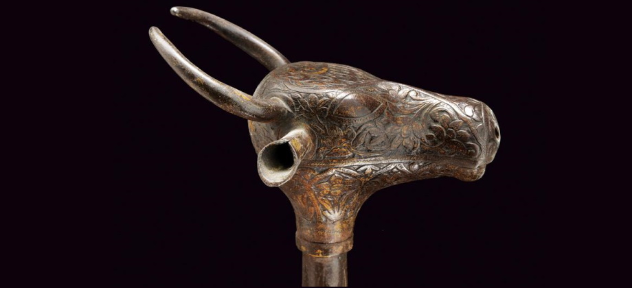 Bull-shaped head mace, with ears and horns, eyes and nose holes, richly engraved with Persian inscriptions and floral motifs with remains of gold decoration. Iron haft with remains of decorations, the base with a pommel.