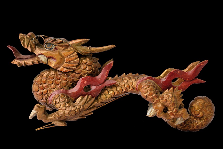 Maedate esculpido em madeira lacada a ouro em forma de Dragão. Uma das garras anteriores segura um globo, em falta o globo contra lateral. A cabeça tem a boca aberta. O corpo do animal é finamente pintado a dourado, com elementos tais como chamas e língua. Garras prateadas (duas em falta). Bigode em arame de latão. Completado com gancho de encaixe em latão.