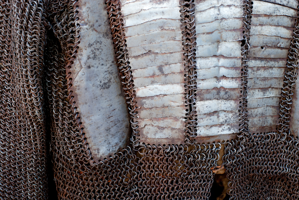 Camisa de cota de malha e lamelas. A parte superior do corpo é composta inteiramente de grandes anéis rebitados de ferro, a parte inferior extendendo-se para saiote cobrindo a totalidade do comprimento das coxas e formado por anéis progressivamente mais pequenos.