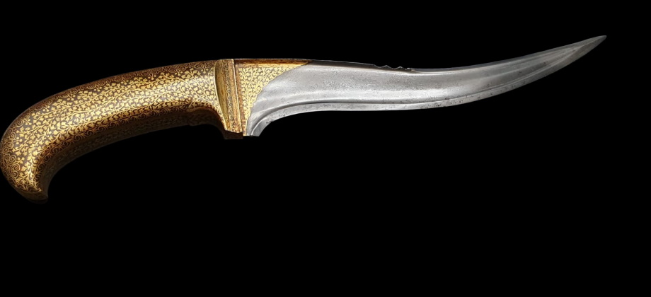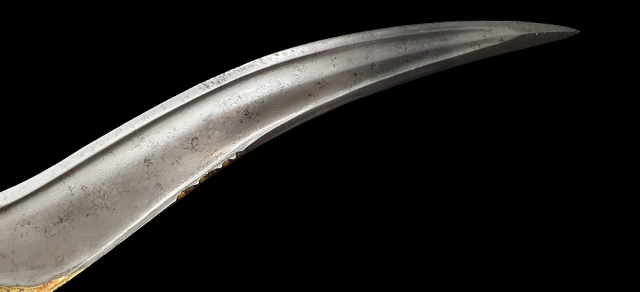 Pesh-Kabs with a pronounced S curved and quite strong T blade in watered steel, reinforced at the back, with a single edge and ending in an extremely fine but reinforced tip, with the intention of trespass the mail chain armour. The forte of the bladeis decorated with raised gold-inlaid floral design "en suite" with the handle. On the back of the blade , close to the forte, there are a chiseled geometric design.