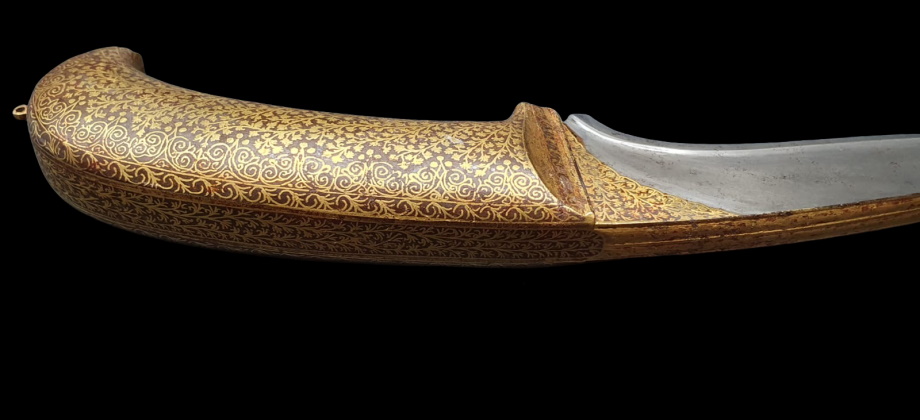 O punho profusamente decorado com um fino padrão floral (estilo Sialkot) com koftgari incrustado em ouro.