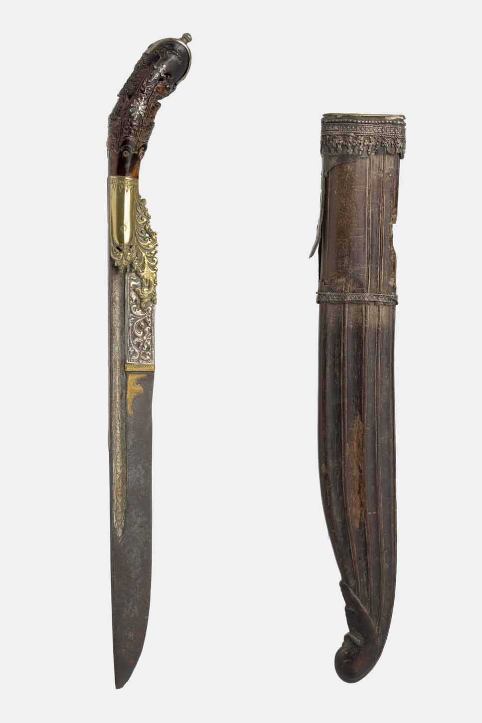 The wooden scabbard is worked into grooves and lacks the usual silver foil covering. This silver is found in the mouth, plain, with only a small vegetal motif frieze.