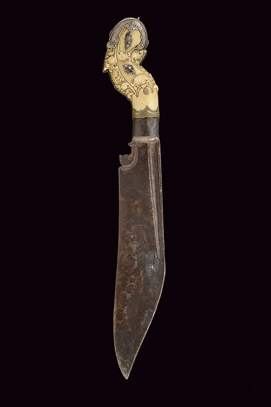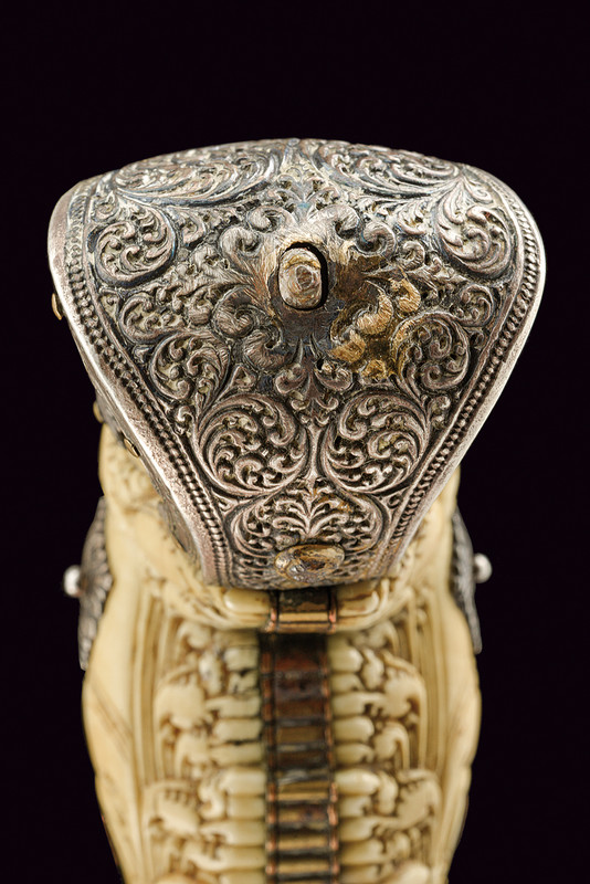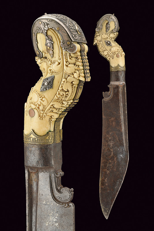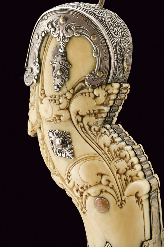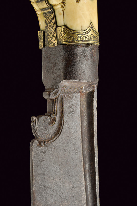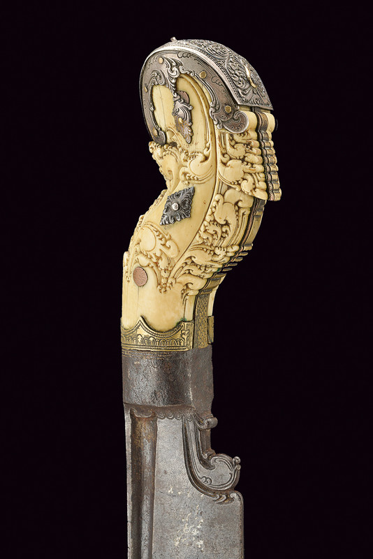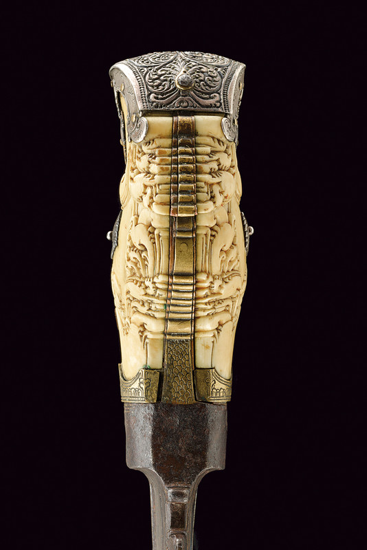 Long, wide and strong, iron blade with deep, rear groove, a chiselled curl at the forte; hilt with brass ring-nut and band, both gilt and engraved, silver cap and rivets finely engraved and embossed with floral motifs; "S"-shaped, ivory grip richly sculpted