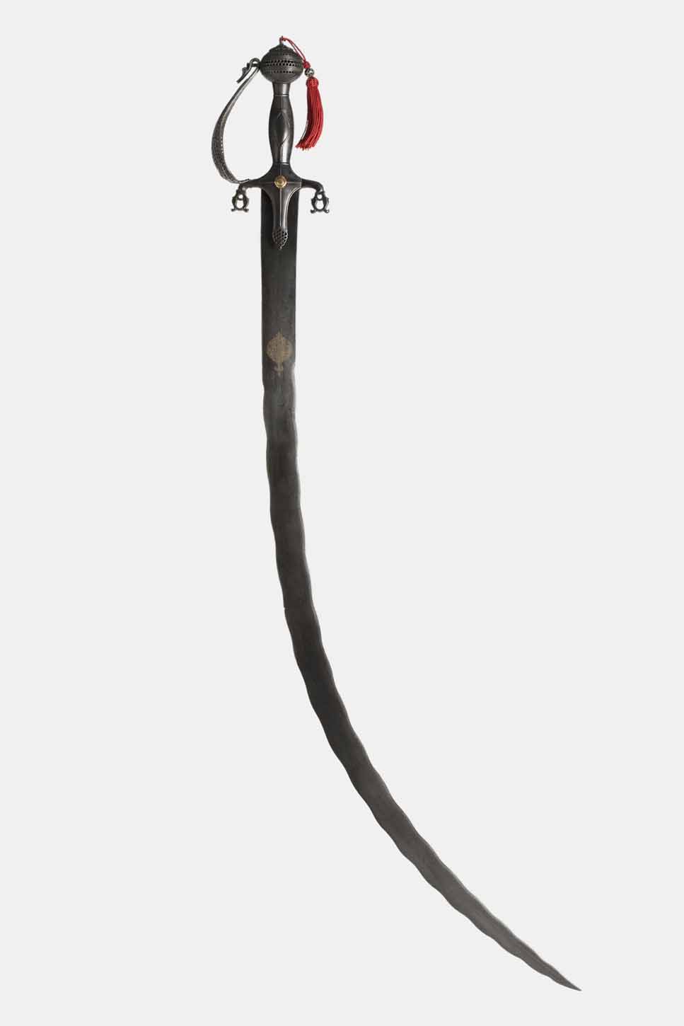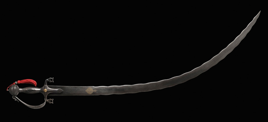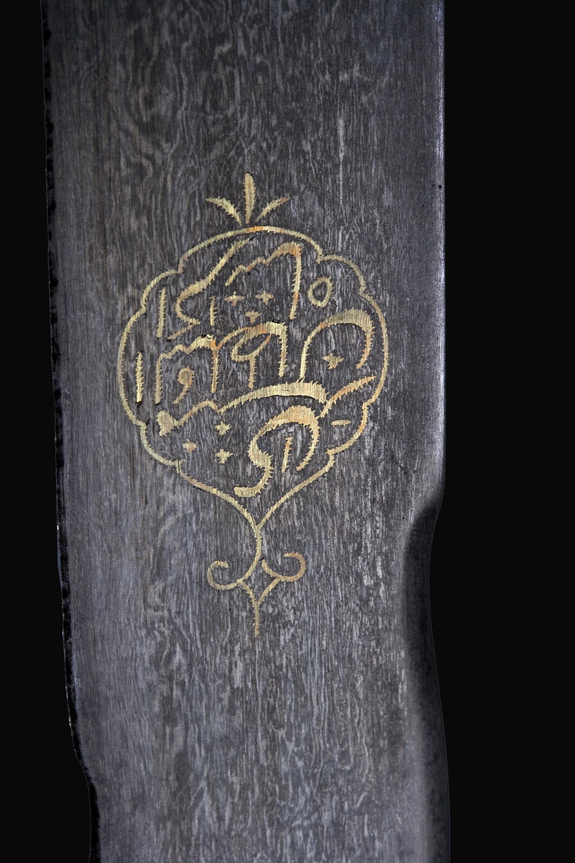 Este exemplar, apresenta a lâmina em aço damasquino, curvada e com ligeiro ondulado no duplo gume. Gravada e incrustada a ouro, surge próximo do punho uma cartela, com a seguinte inscrição: Akbar Sha al-Sultan Mirza .