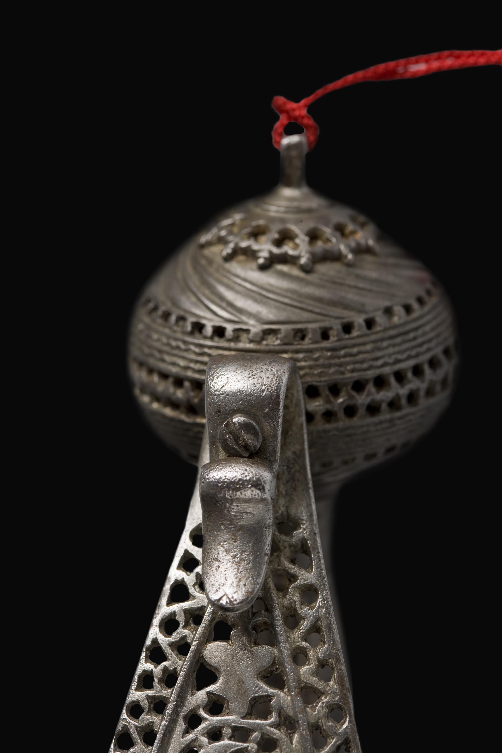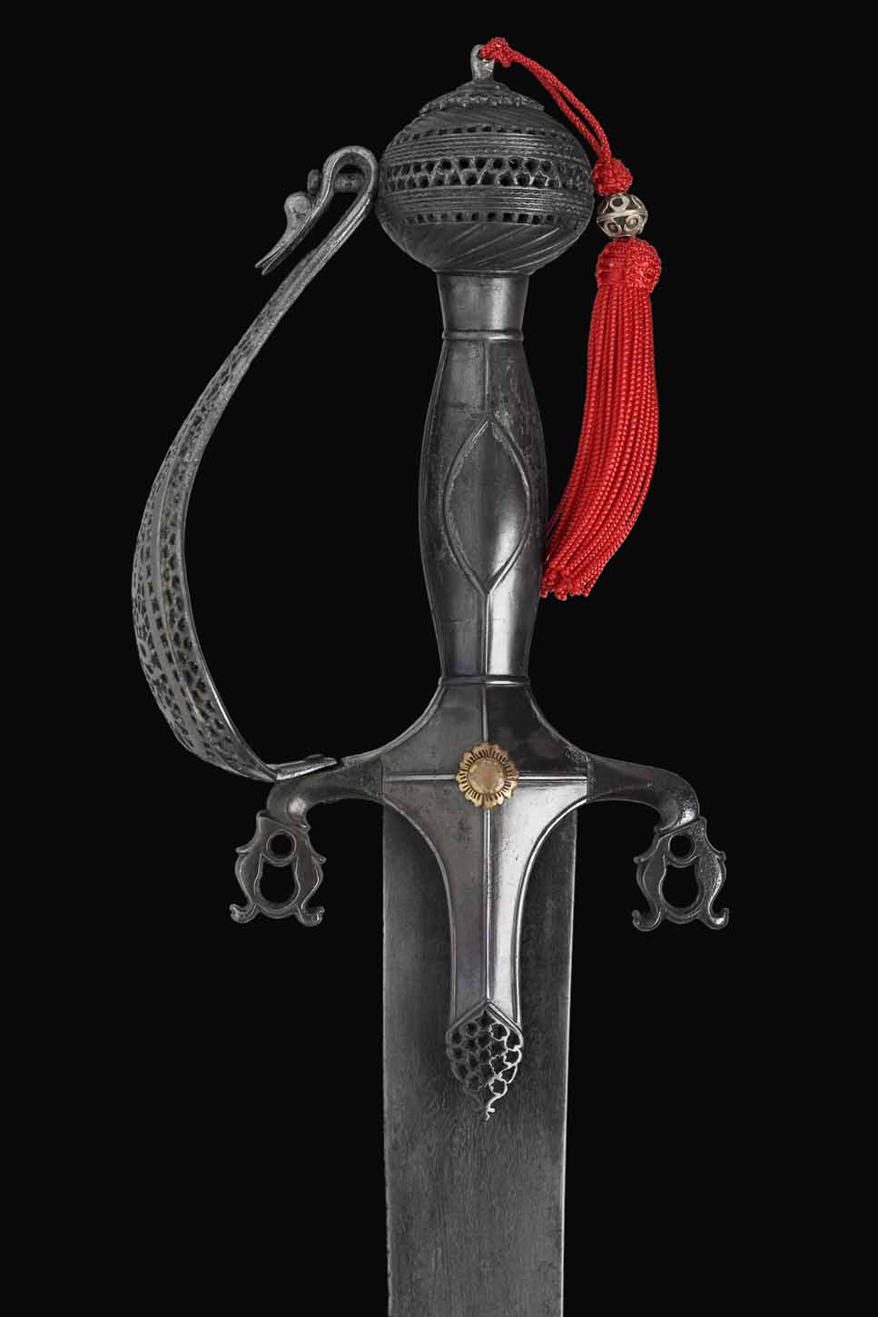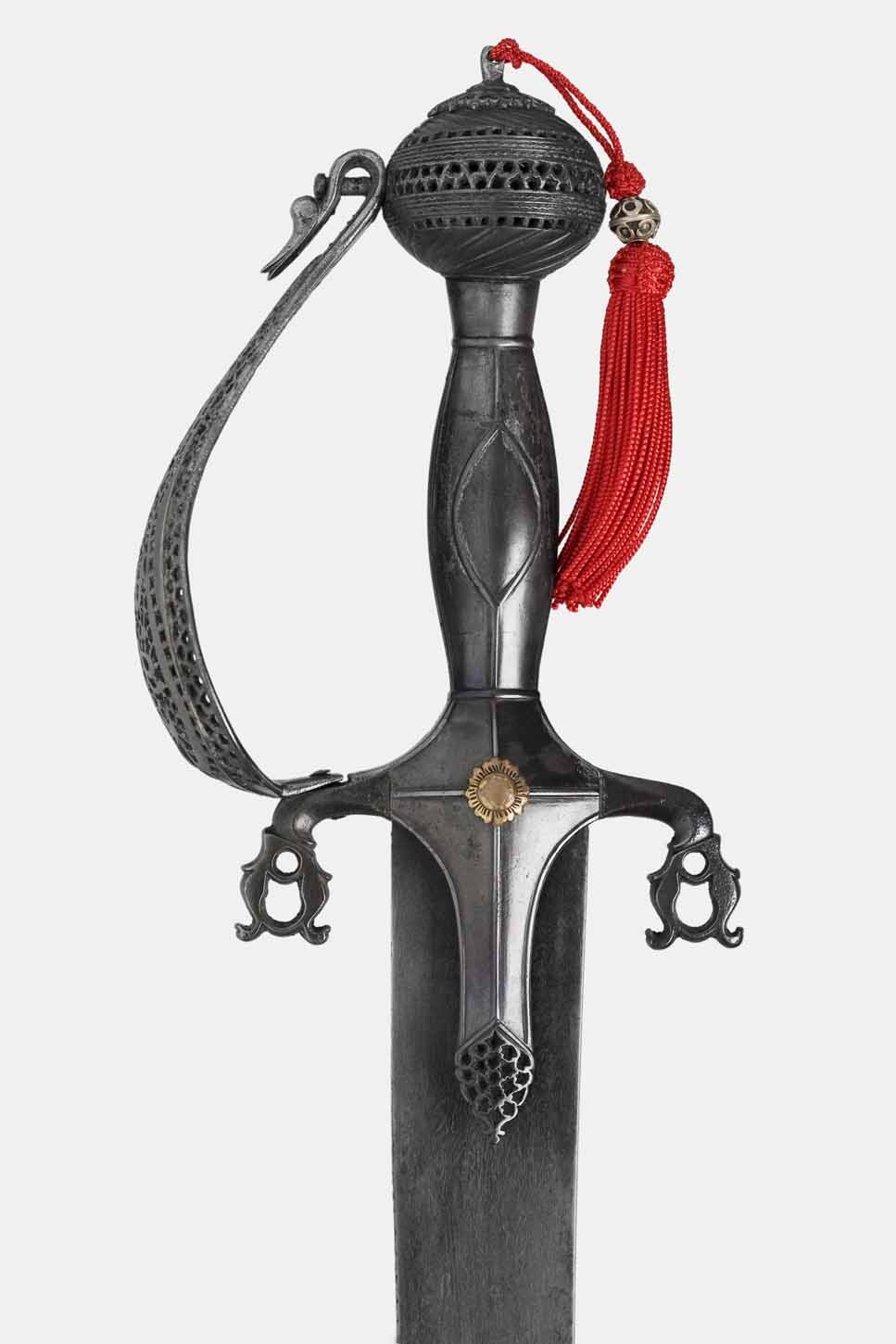 O punho, também de aço, mostra um pomo esférico todo trabalhado em vazado reticulado e em registos de motivos geométricos.