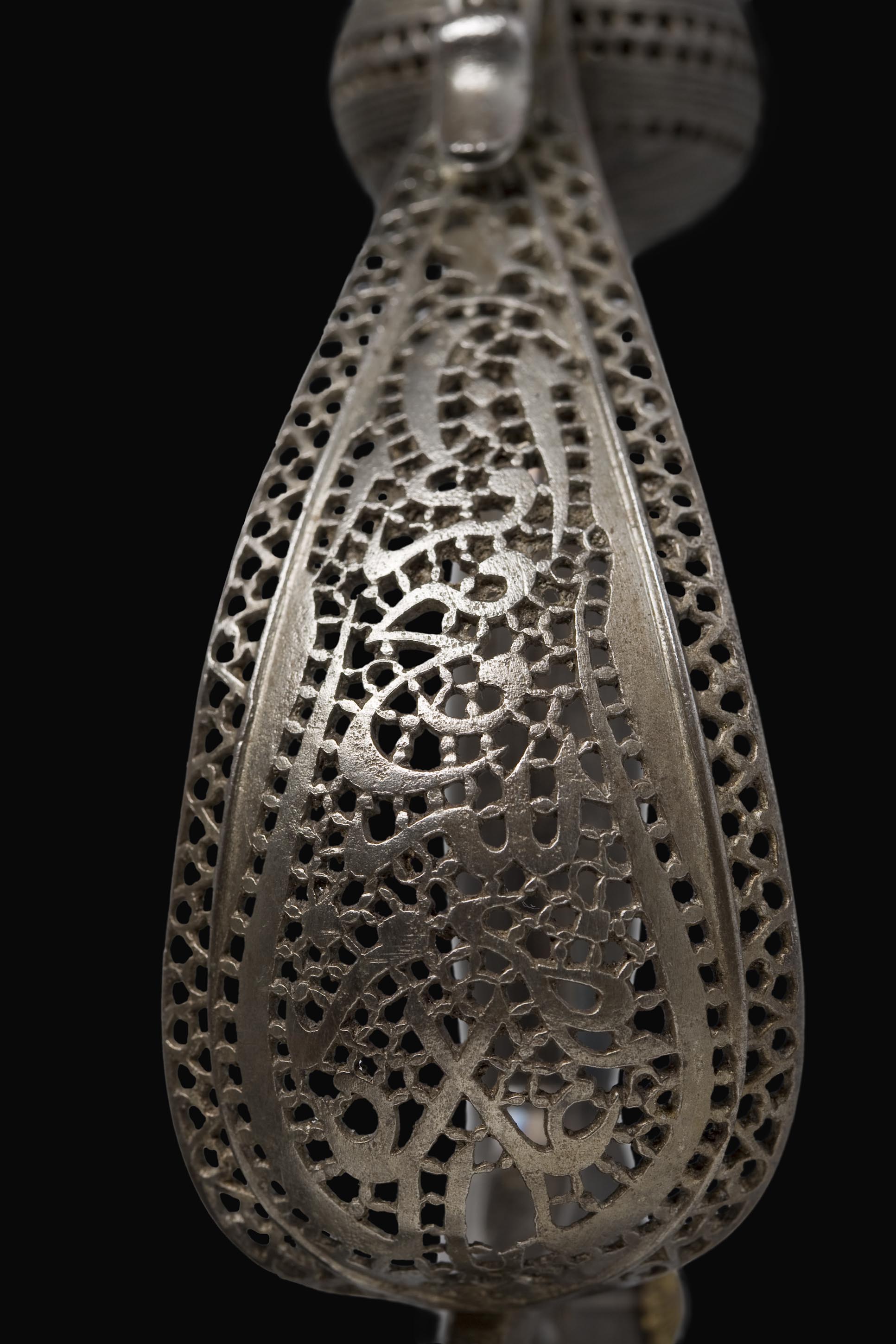 O guarda-mão termina numa delicada cabeça de cisne na zona do pomo, e surge também elaborado em vazado, contendo, ao centro, uma inscrição com um nome, Ali, seguido da frase nasr min Allah wa il-fath qrabi.