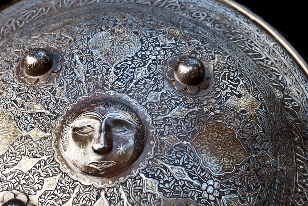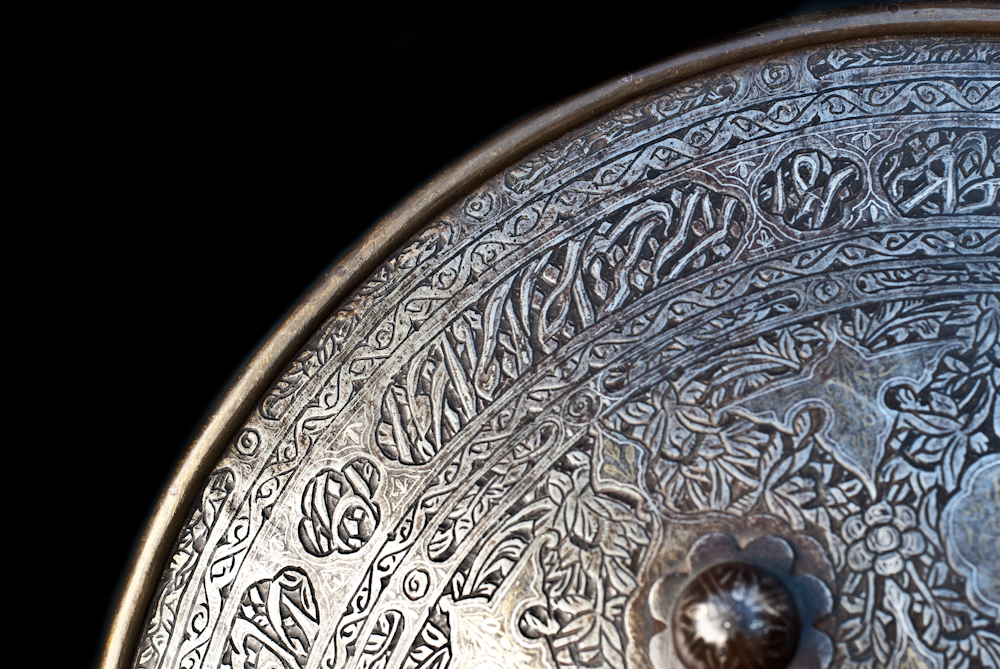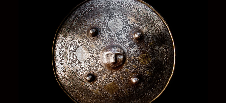 A Persian circular shield with gold and silver inlays with a domed shape with a chased face in relief in the centre. The entire surface is cut with floral decoration with gold and silver-inlaid cartouches.