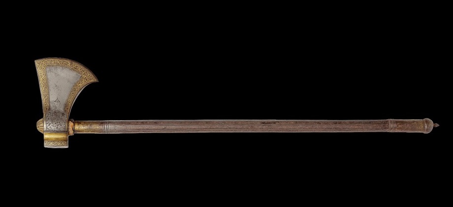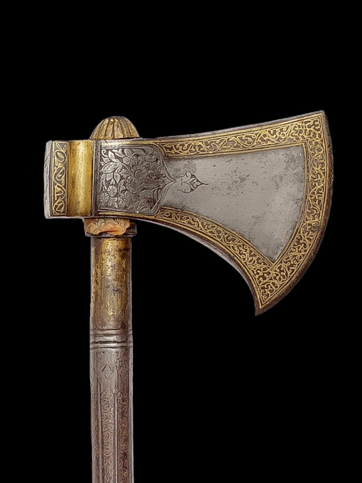 Com uma cabeça robusta de aço de wootz, de lâmina convexa e rodeado dos dois lados em trabalho em ouro damasquinado, sendo as superfícies superiores e inferiores no mesmo estilo.O encaixe redondo é trabalhado com vegetação florida de ambos os lados, e a parte de trás, dourada e em forma de bloco, é trabalhada com a imagem de um bode e folhagem dentro de um painel em forma de estrela. O cabo em aço tubular, é trabalhado com finas linhas longitudinais e esculpido em imitação de água, o terminal superior é coberto com um botão e acabado com um remate dourado esculpido com motivo de estrias. Cabeça, 14 cm.