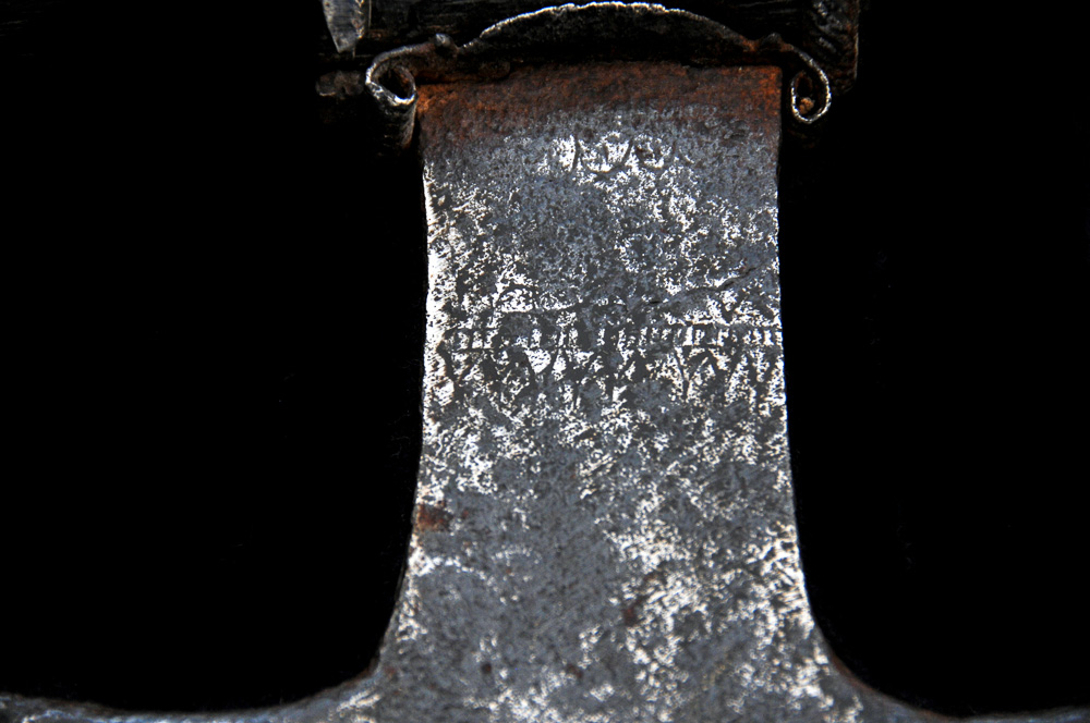 Sólida lâmina em ferro com a forma de crescente, firmemente fixada ao cabo.